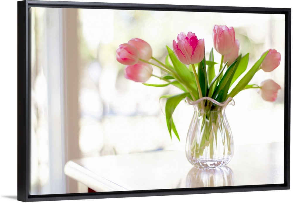 <p>Ruffled pink glass vase filled with soft, pink tulips sitting on table in front of window bright with sunlight.</p>