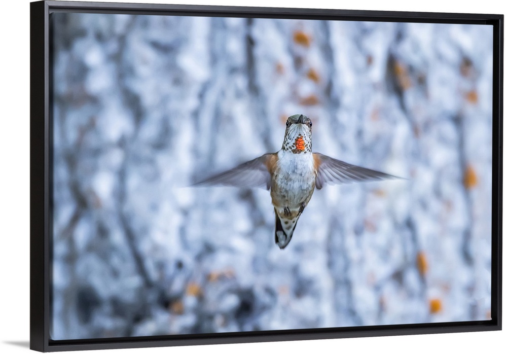 <p>Rufous hummingbird (Selasphorus rufus) flying in mid-air; Atlin, British Columbia, Canada</p>