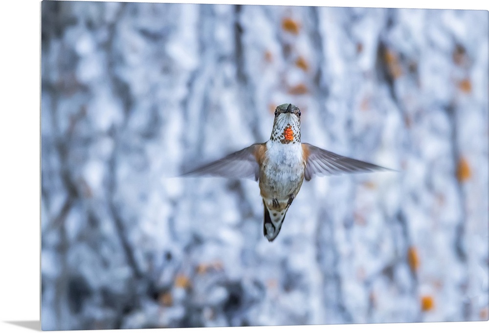 <p>Rufous hummingbird (Selasphorus rufus) flying in mid-air; Atlin, British Columbia, Canada</p>