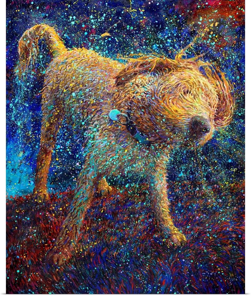 <p>Brightly colored contemporary artwork of a shaggy dog shaking off water.</p>