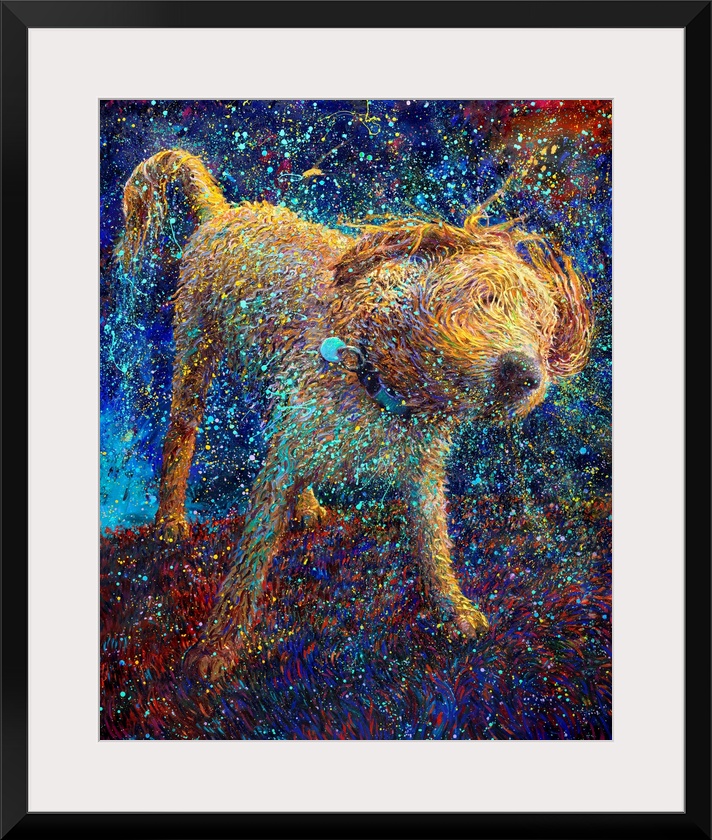<p>Brightly colored contemporary artwork of a shaggy dog shaking off water.</p>