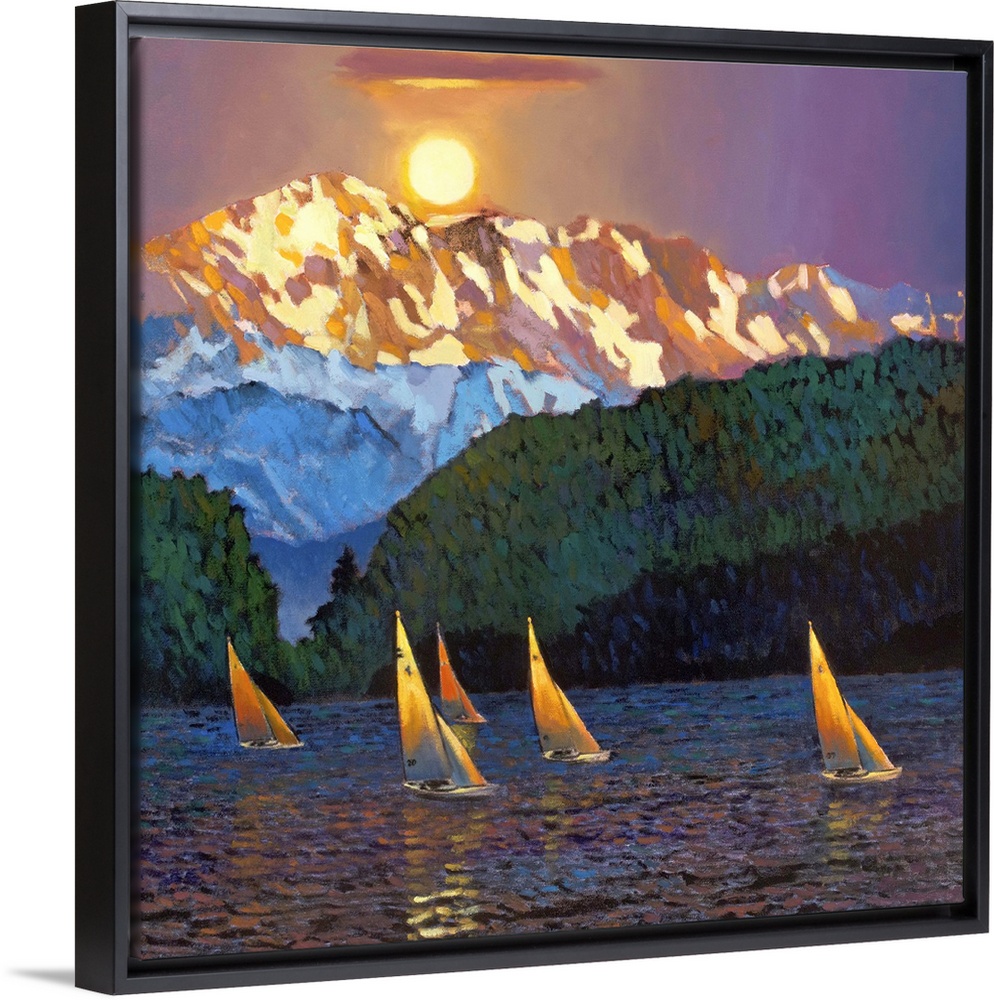 <p>Contemporary painting of five sailboats on the water with the sun setting over a tall mountain peak.</p>