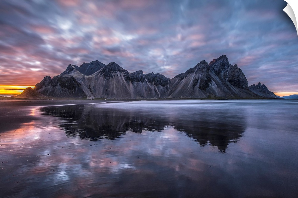 <p>Rugged mountain peaks and a colourful sunset reflected in tranquil water. Iceland.</p>