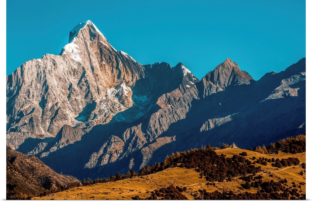 <p>Rugged mountainous terrain of Mount Siguniang under a bright blue sky, Siguniang National Park Ngawa Prefecture, Sichuan, China</p>