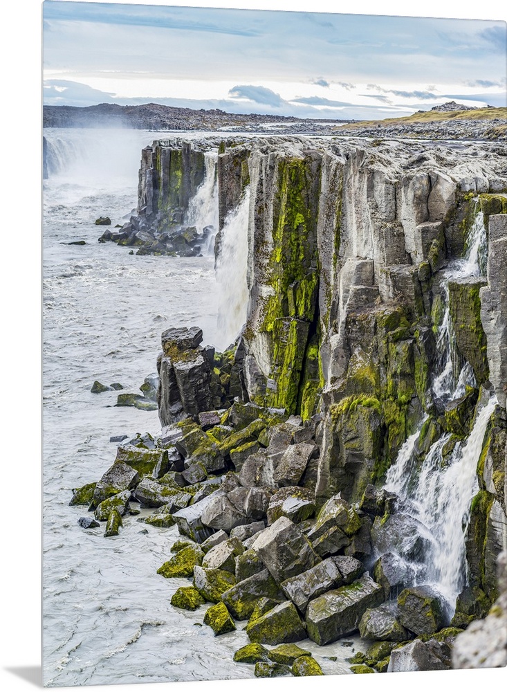<p>Rugged rock cliffs along Jokulsa a Fjollum river at Dettifoss waterfall, reputed to be the second most powerful waterfall in Europe after the Rhine Falls; Skutustadahreppur, Northeastern Region, Iceland.</p>