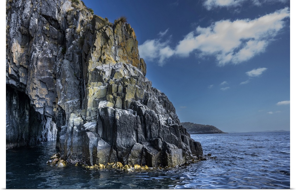 <p>Rugged rock formations along the coast of Bruny Island in the Pacific Ocean, Tasmania, Australia; Bruny Island, Tasmania, Australia.</p>