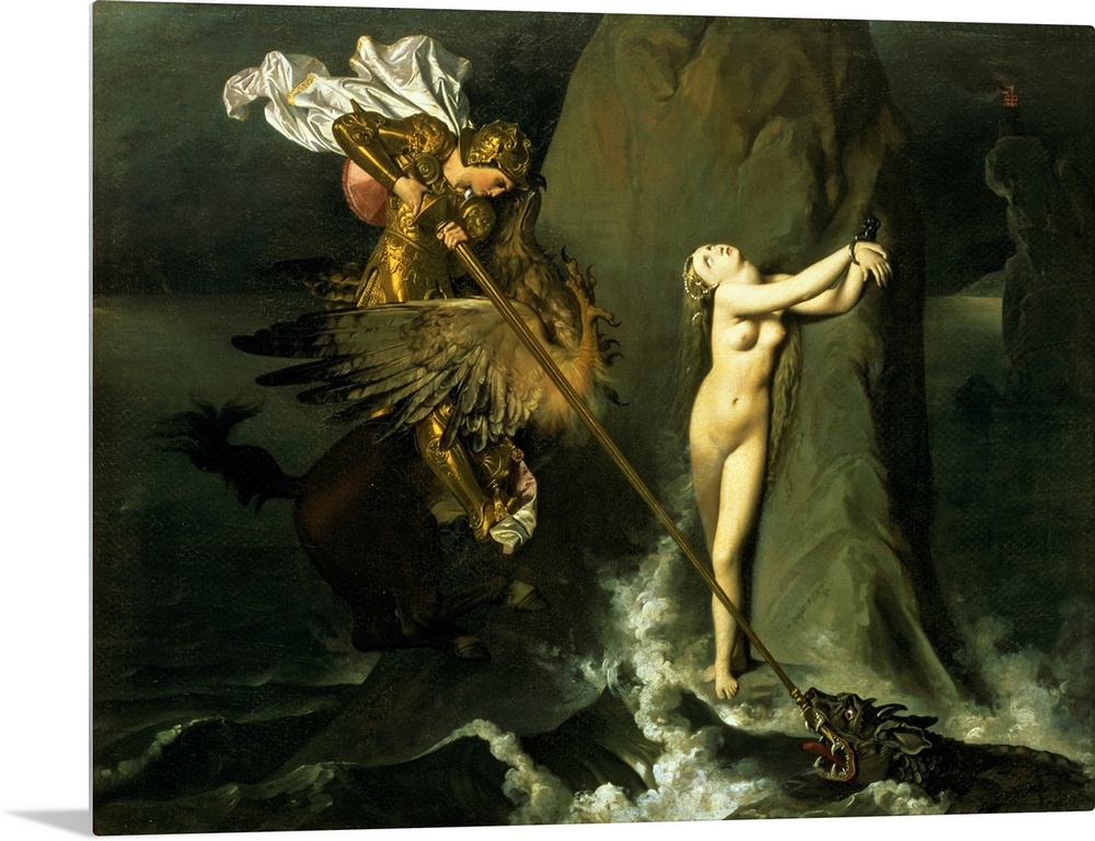 <p>XIR59757 Ruggiero Rescuing Angelica, 1819 (oil on canvas); by Ingres, Jean Auguste Dominique (1780-1867); 147x199 cm; Louvre, Paris, France; Giraudon; French, out of copyright</p>