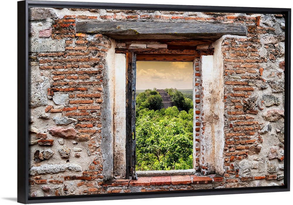 <p>View of the Ruins of the ancient Mayan City of Calakmul, Mexico, framed through a stony, brick window. From the Viva Mexico Window View.</p>