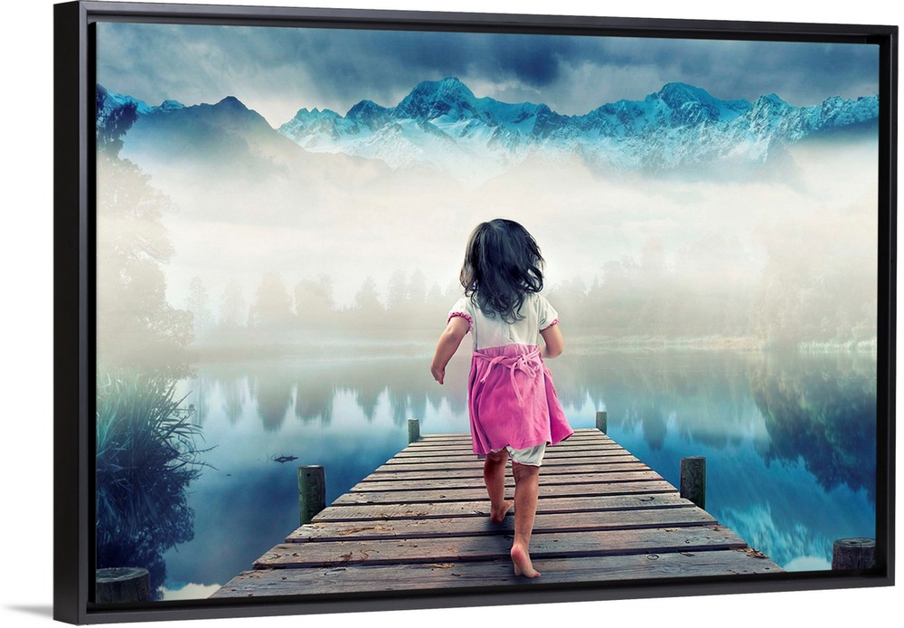 <p>A young girl running on a wooden pier to a misty lake in the mountains.</p>