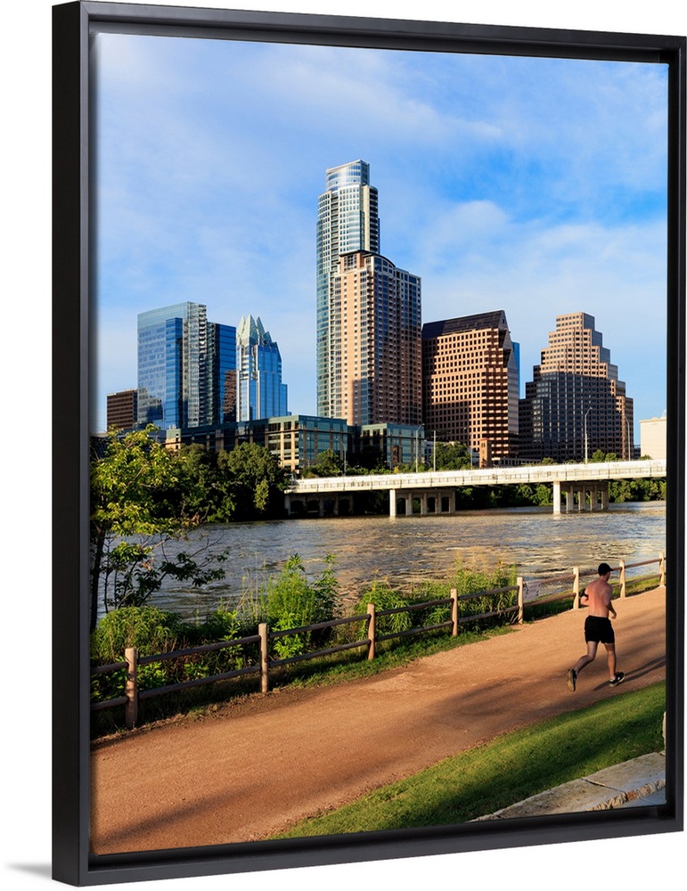 <p>Runner on path along south shore of Lady Bird Lake in downtown Austin, Texas, USA.</p>