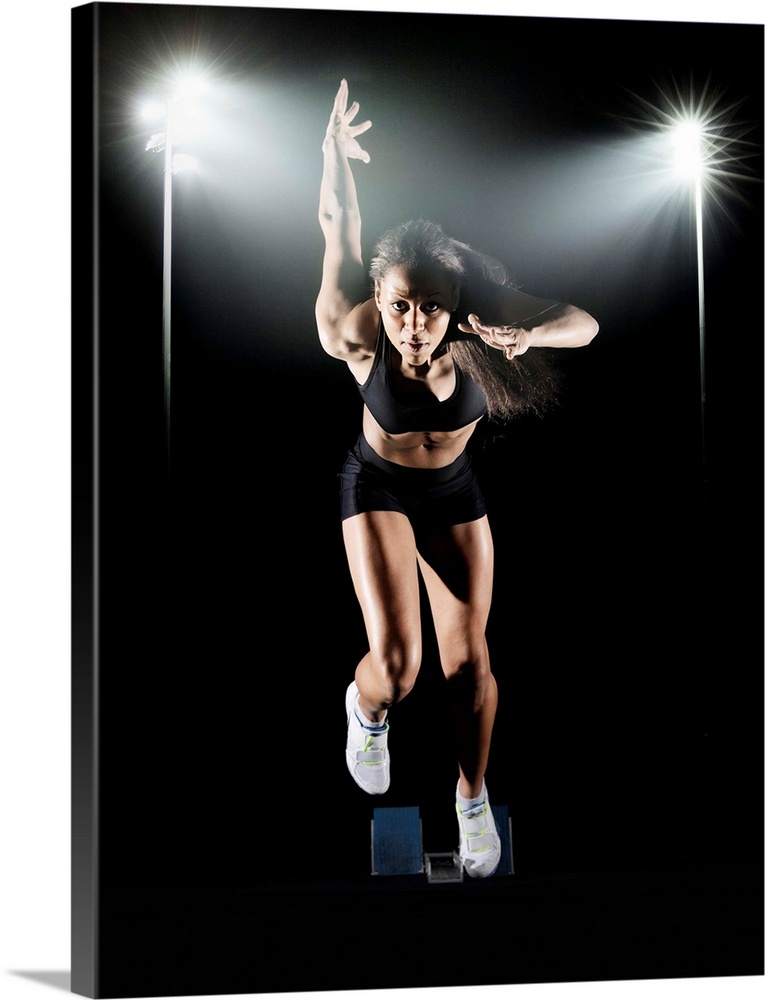 <p>Female runner springs from the starting line in a stadium as she begins a race.</p>
