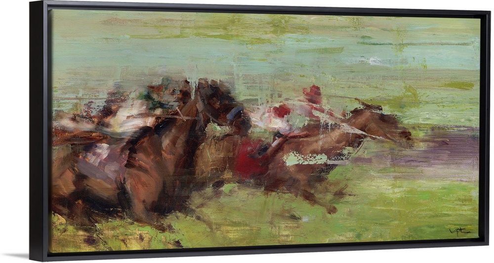 <p>A contemporary painting of a horse derby, with the feel of the horses moving in a fast pace.</p>