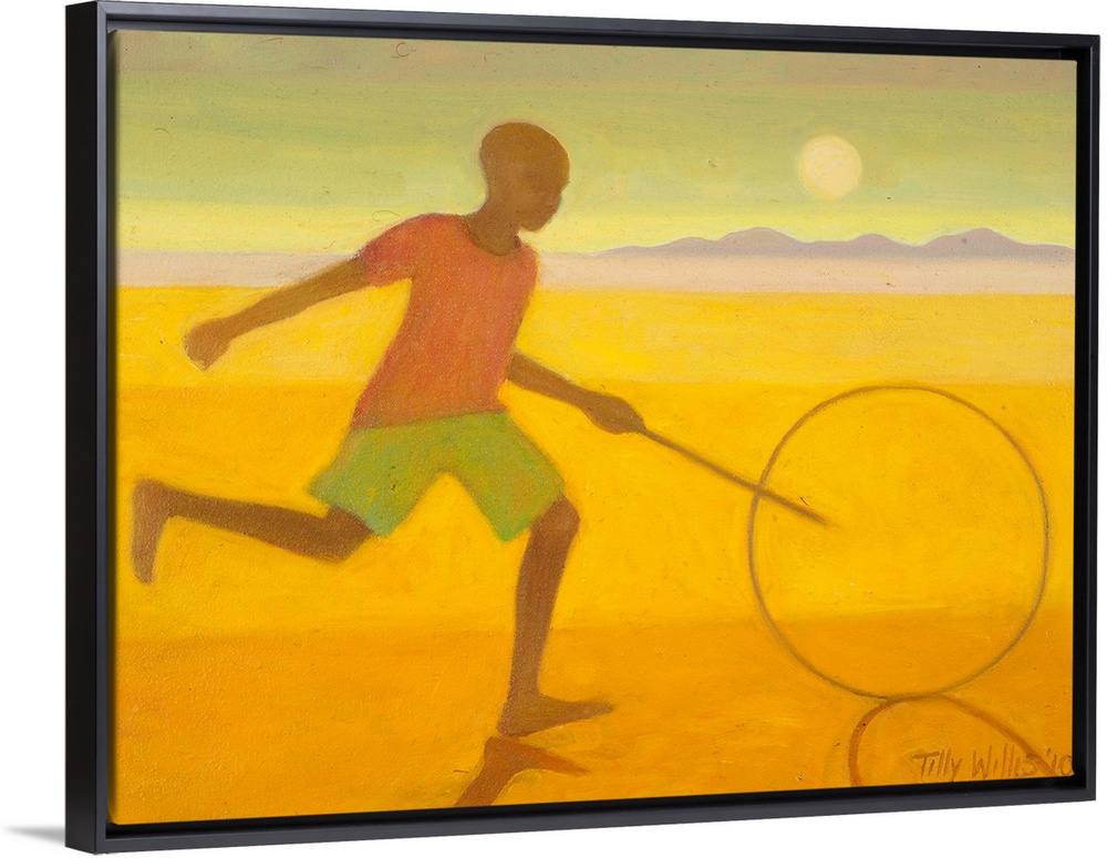 <p>Contemporary artwork of a boy running on the beach with a hoop and stick.</p>