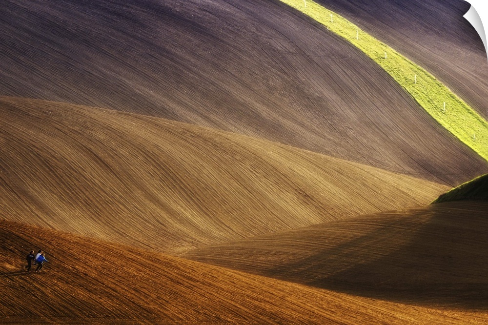 <p>Three people run across dusty hills, with a streak of grass and power lines in the distance.</p>