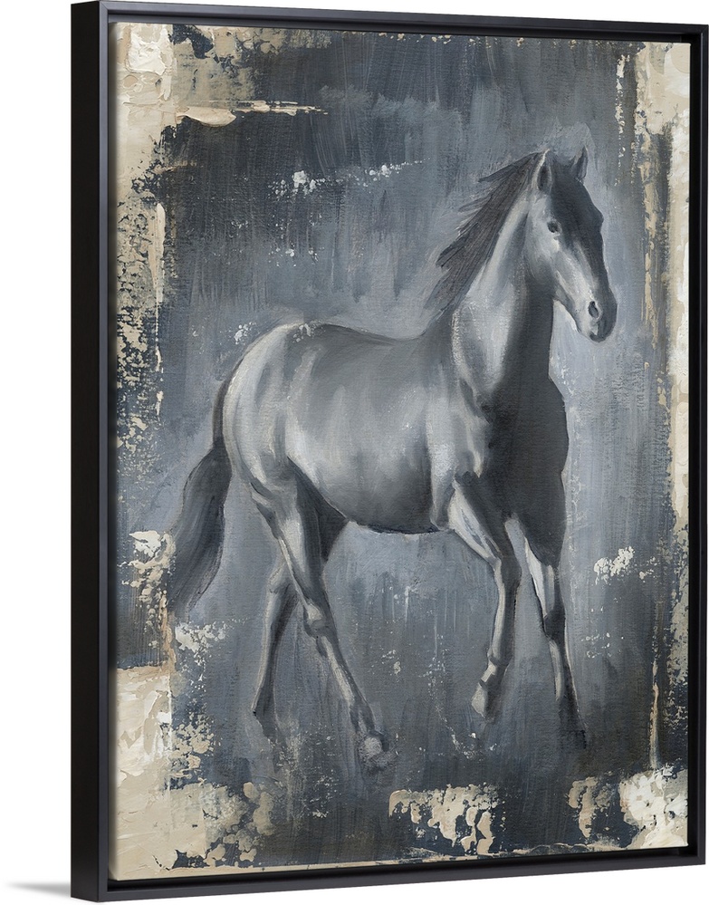 <p>Artwork of a grey stallion against a similar colored background with a tan distressed border around it.</p>