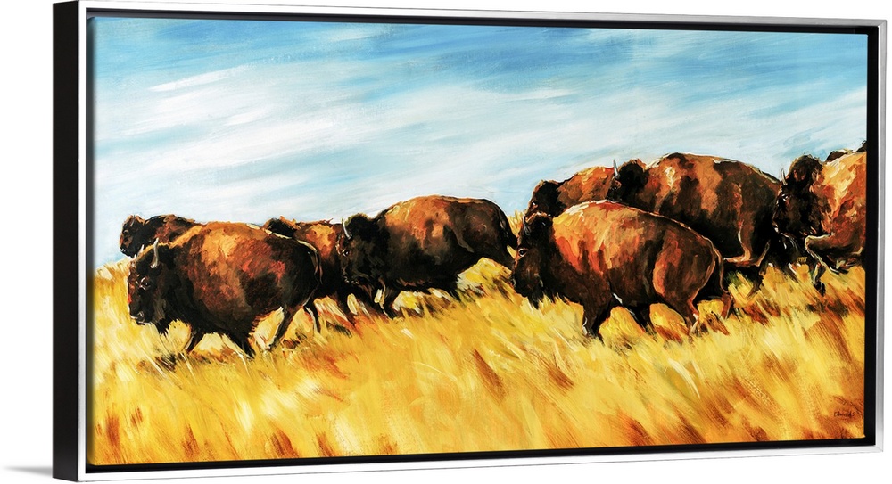 <p>Painting of a herd of buffalo running wild on a grassy plain.</p>