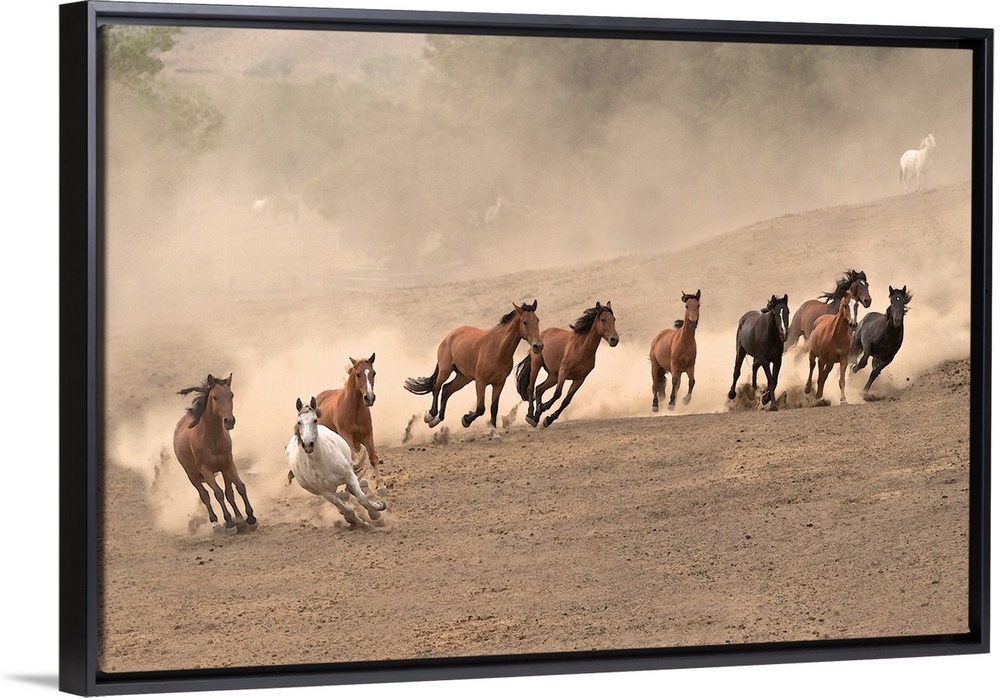 <p>Photograph of a team of wild horses barreling over the hillside by Sally Linden.</p>