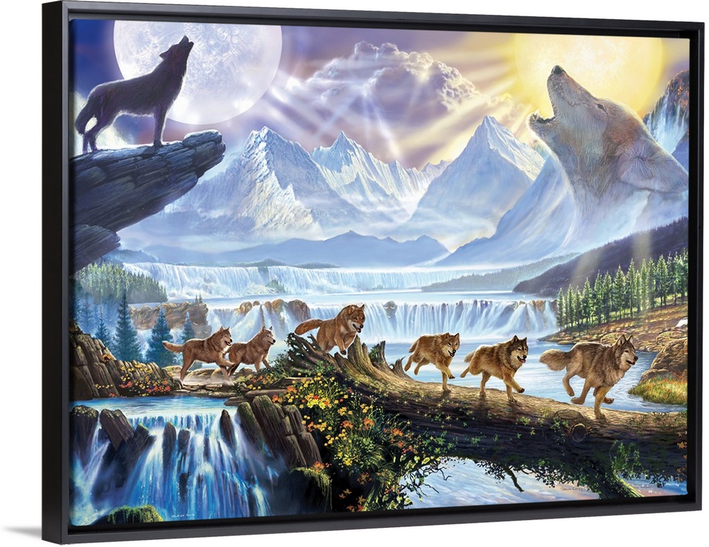<p>Main wolf in the centre of the picture with two howling wolves either side with mountains and waterfalls</p>