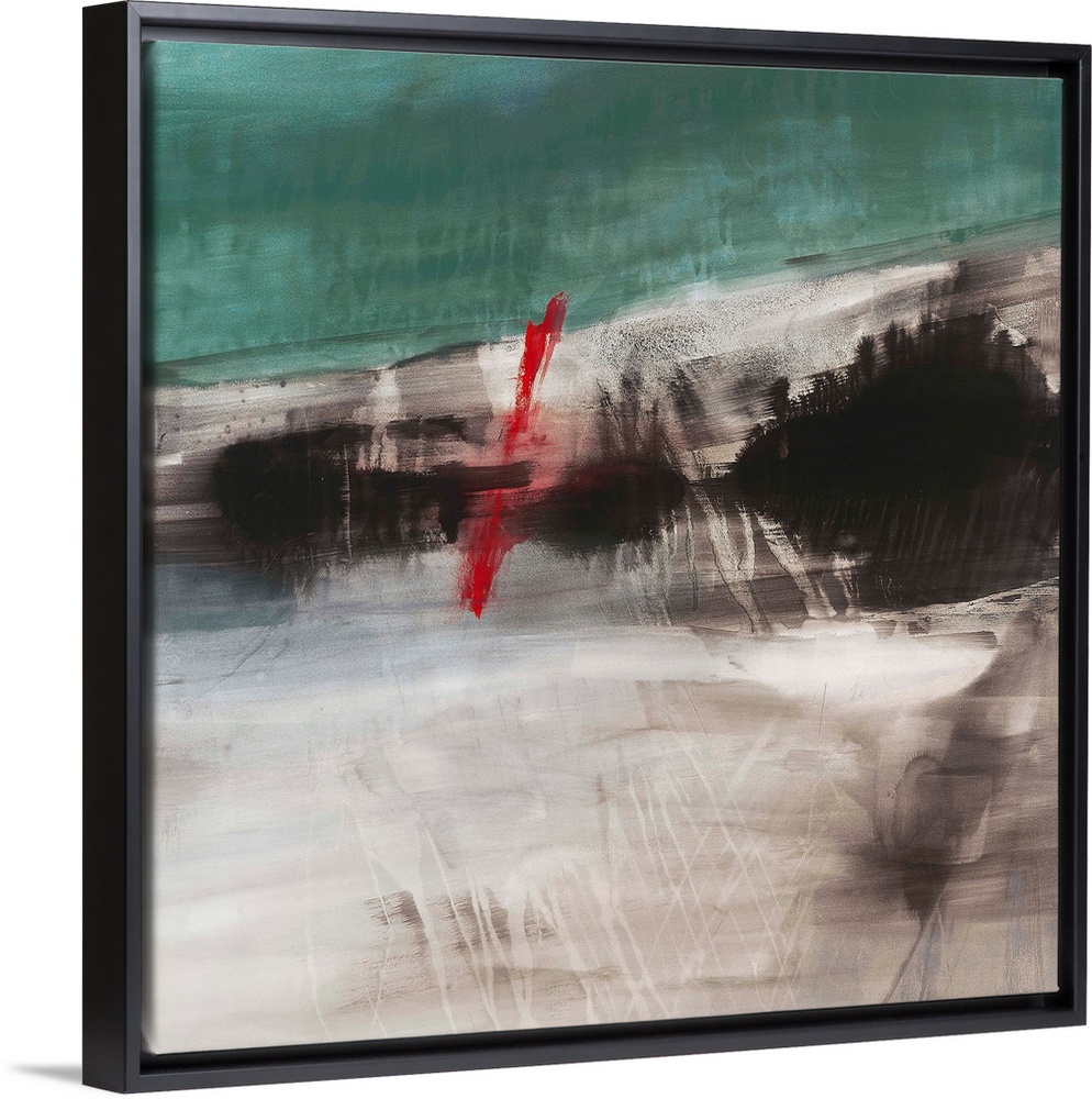 <p>Square abstract painting in teal, black, white, and a little pop of red.</p>