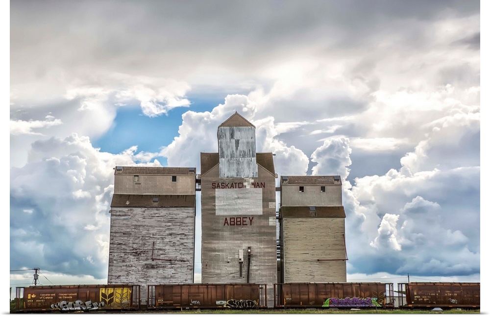 <p>Rural grain elevator with cumulonimbus clouds building up around it, Saskatchewan, Canada.</p>