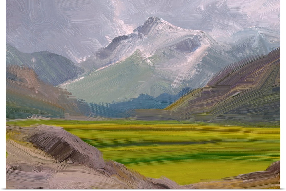 <p>2D illustration. Originally an oil painting of landscape art. Rural mountain region. Colorful green field and grass. Summer time. Countryside.</p>
