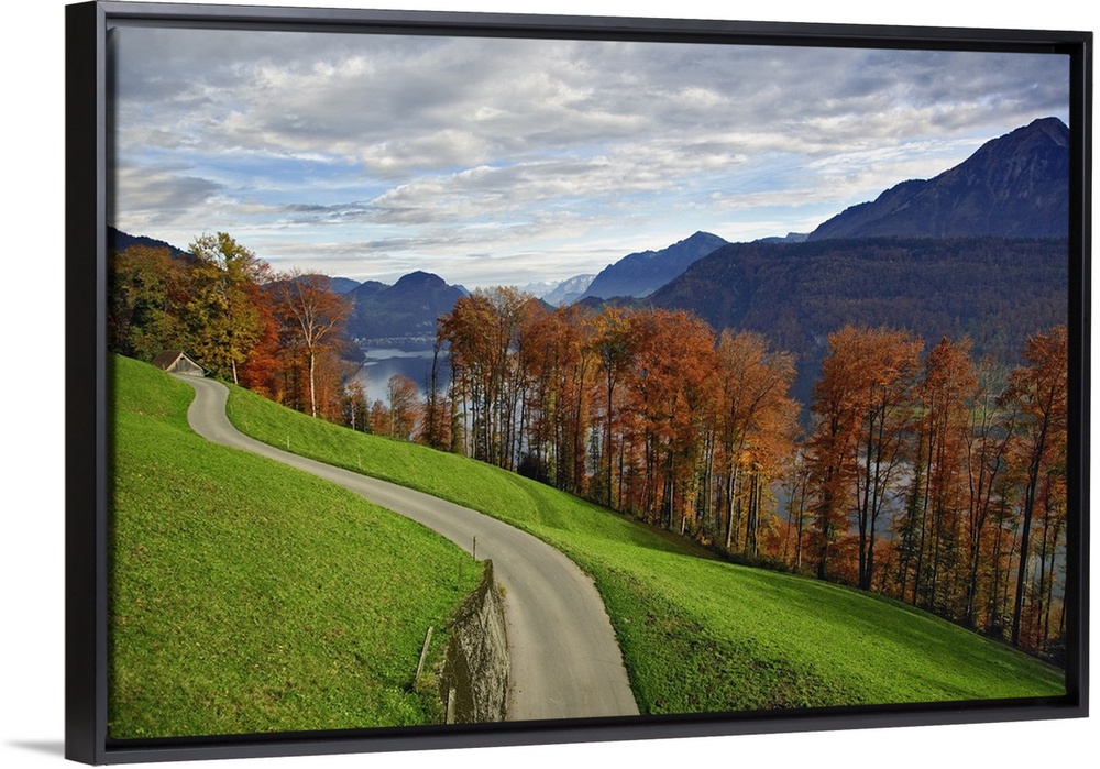 <p>Rural road and autumn foliage along lake, near Lucerne, Switzerland</p>