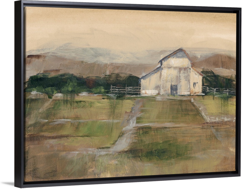 <p>Contemporary artwork of farmland and a white barn in low afternoon light.</p>