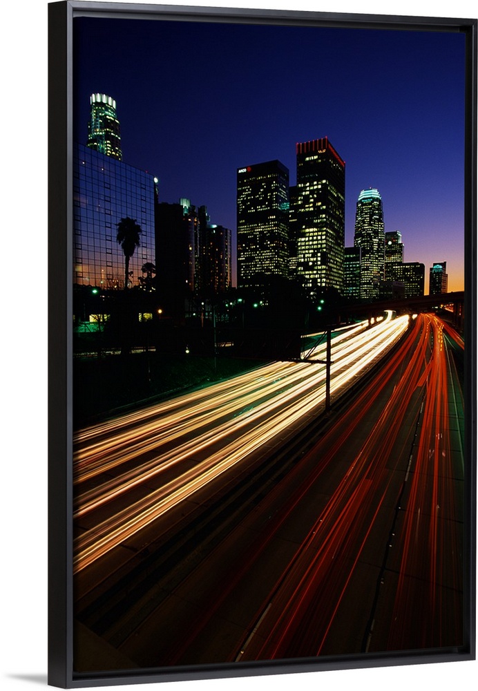 <p>Vertical photograph of the light trails of cars on the Harbor Freeway in Los Angeles, California at night.</p>