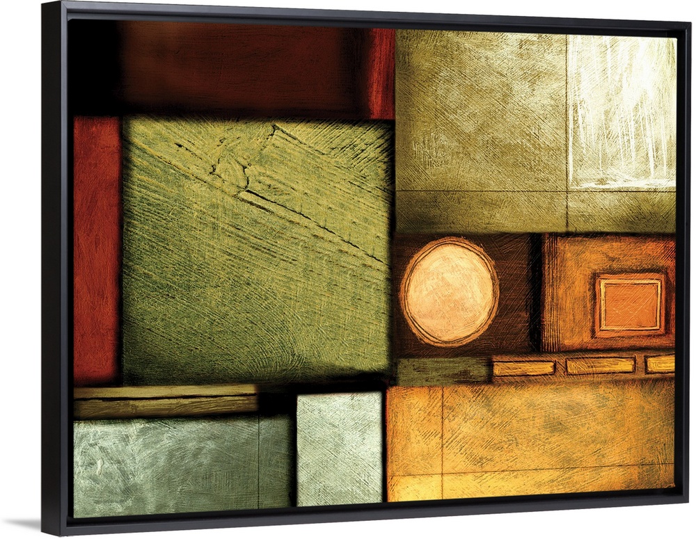 <p>Abstract painting of squared shapes overlapped with circular elements done in warm earth tones.</p>