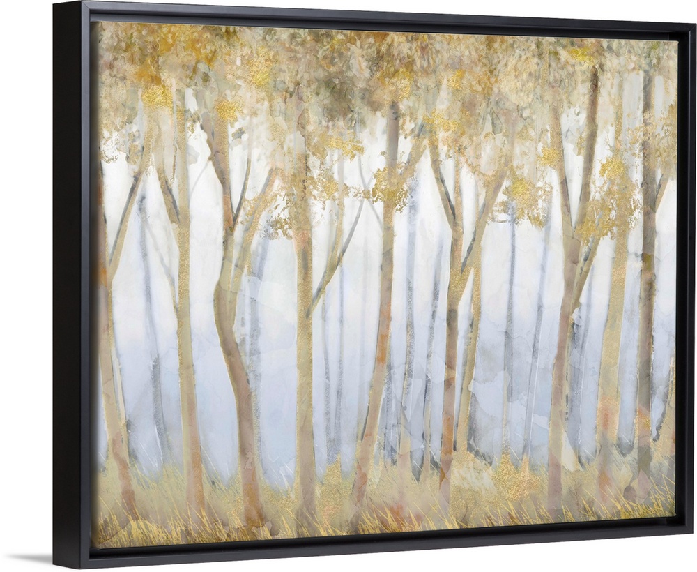 <p>Contemporary painting of a glade of slender golden trees over pale dusty blue.</p>
