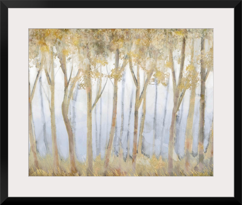 <p>Contemporary painting of a glade of slender golden trees over pale dusty blue.</p>