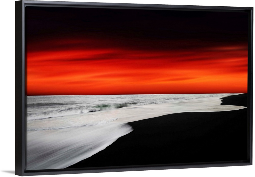 <p>A dramatic photograph of a blazing sky hanging over a white seascape seen from a black sand beach.</p>