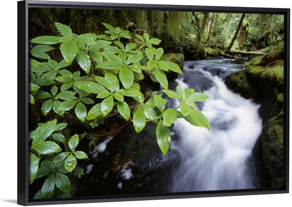 <p>Photograph taken of rushing water that serves as a background to a branch of leaves in the forefront of the picture.</p>