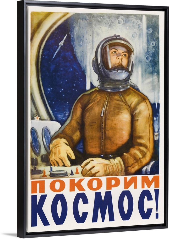 <p>Russian space propaganda poster of a cosmonaut in a space capsule.</p>