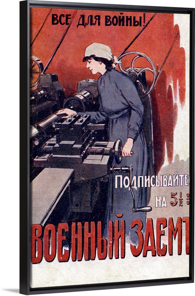 <p>Russian War Bonds poster in WWI. Caption at top: : Everything for the War!' At the side and bottom: 'Sign up for 5.5% war bonds!'. Proletariat woman working on the home front while men are at war front.</p>