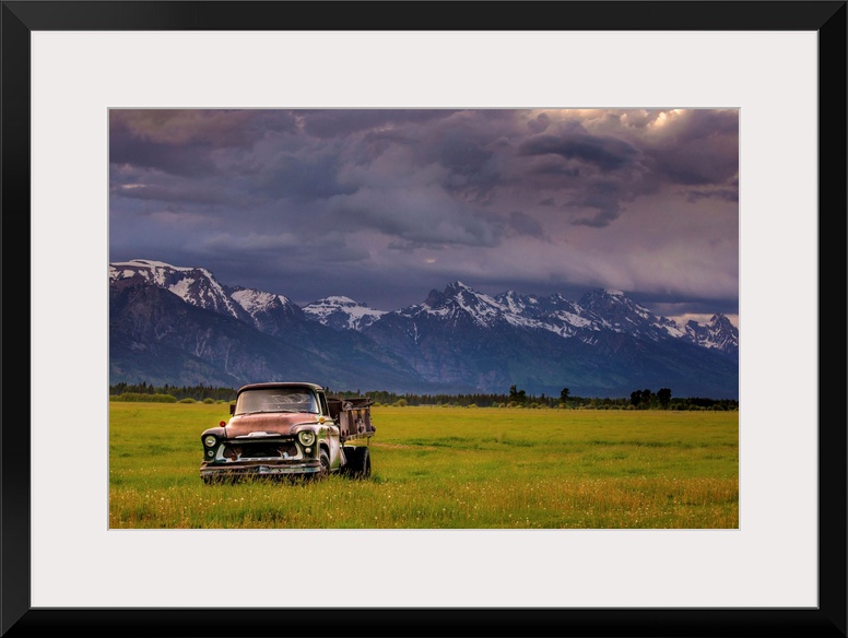 <p>Landscape photograph of a yellow-green field with an old rusted truck and snow capped mountains in the background.</p>