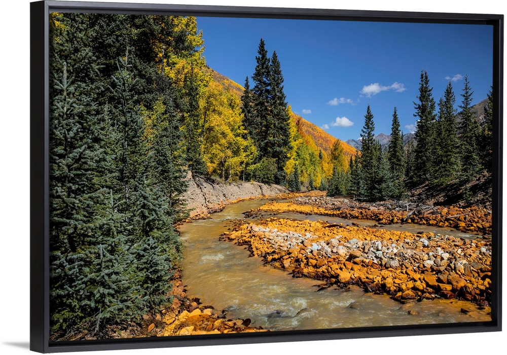 <p>Rusted red rocks along Ironton Creek of golden autumn aspen trees and evergreens, ghost town of Ironton, Colorado</p>