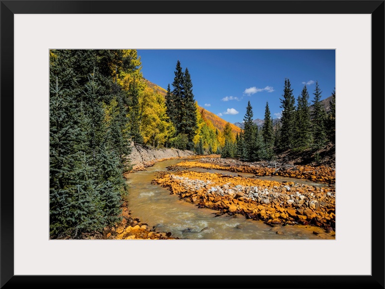 <p>Rusted red rocks along Ironton Creek of golden autumn aspen trees and evergreens, ghost town of Ironton, Colorado</p>