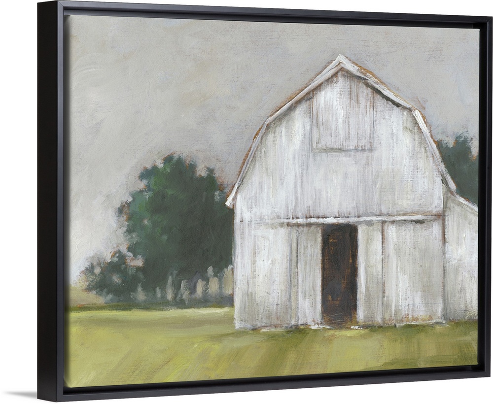 <p>This rustic artwork features spirited brush strokes to create a worn white barn placed over a grassy field.</p>