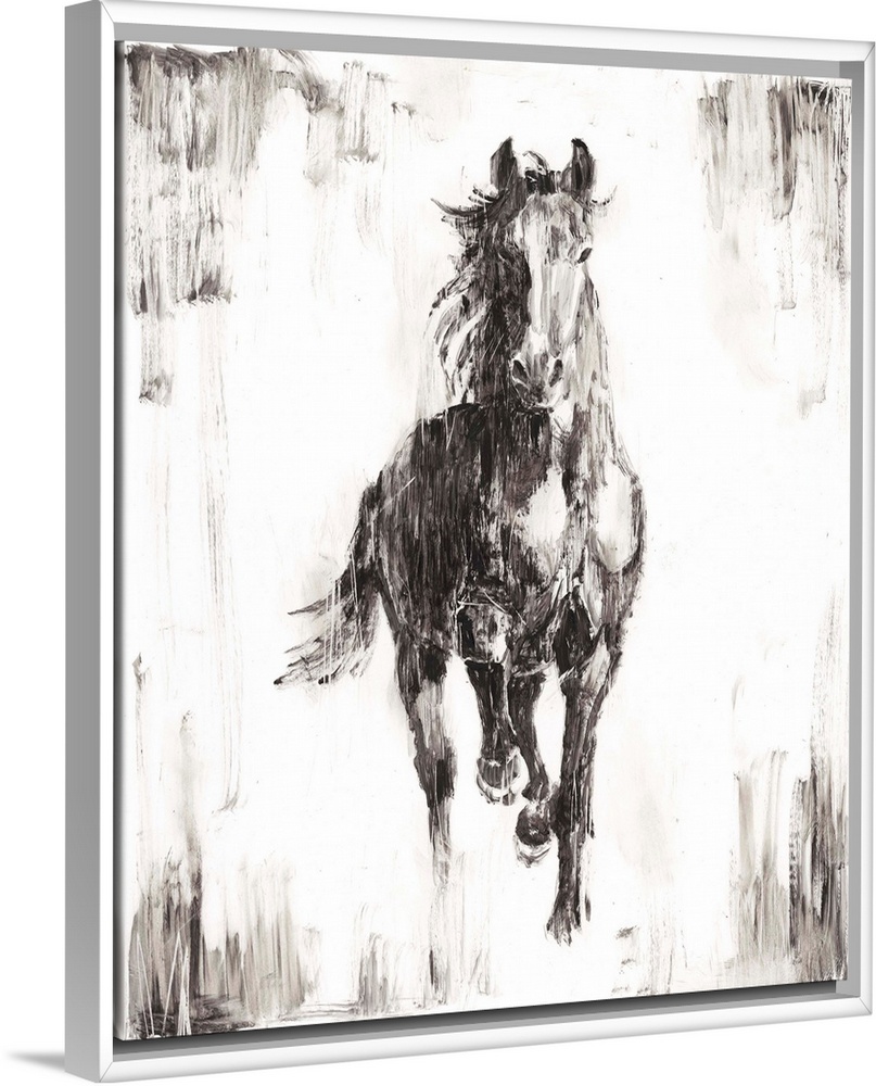 <p>Vertical painting of a running horse done if varies shades of gray and white with a rough brush stroke feel.</p>