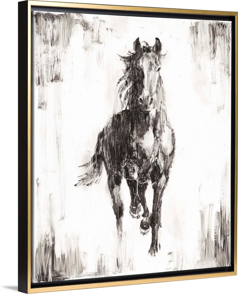 <p>Vertical painting of a running horse done if varies shades of gray and white with a rough brush stroke feel.</p>