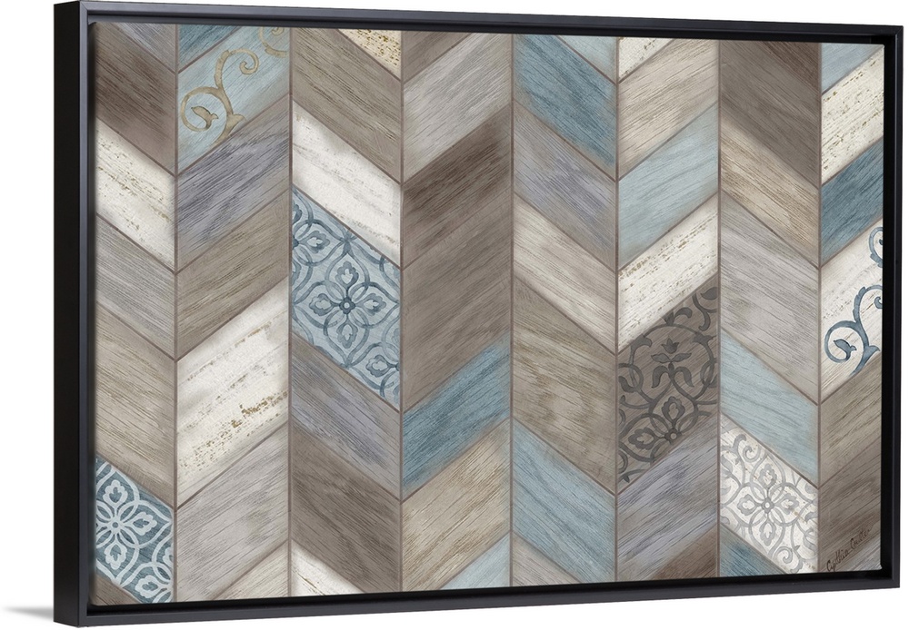 <p>Artwork of multi-colored wood shapes making a chevron design featuring a floral pattern throughout.</p>