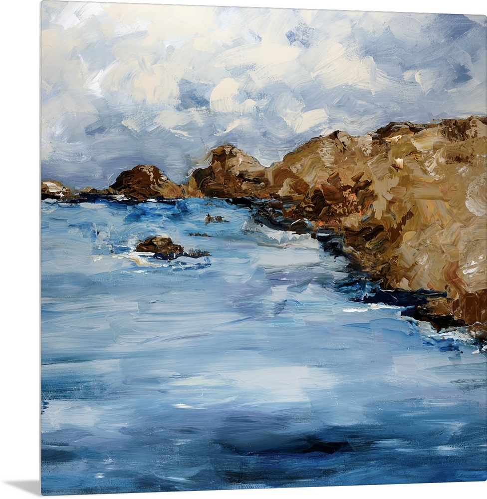 <p>Square, giant painting of a rocky coastline beneath a cloudy sky, painted with large, layered, directional brushstrokes.</p>