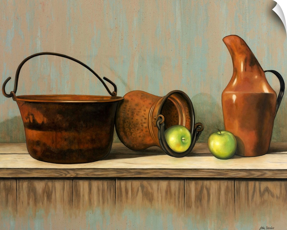 <p>Old copper pails and jug with two green apples</p>