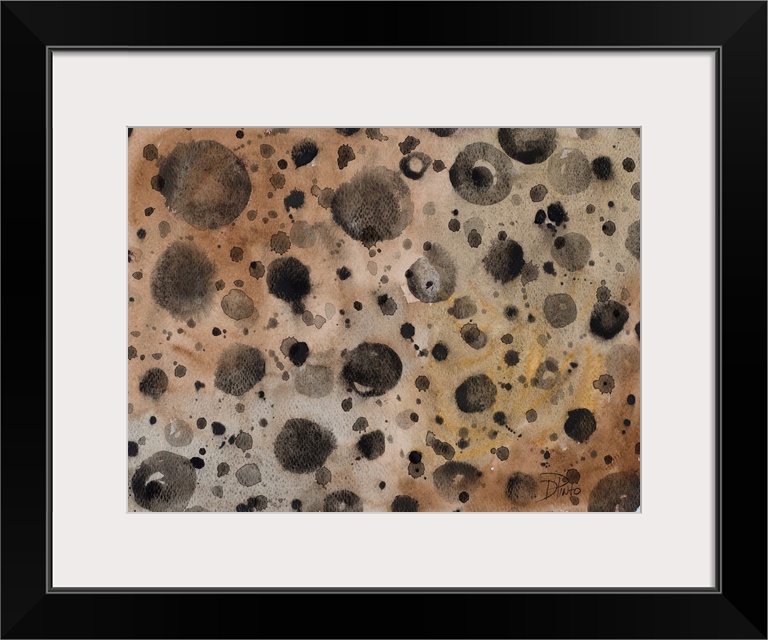 <p>A patterned watercolor painting with black paint splatter on a brown background with hints of gold.</p>