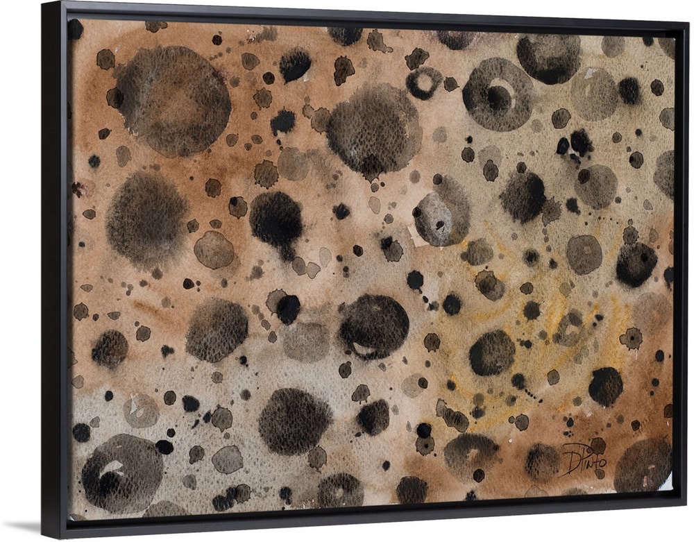 <p>A patterned watercolor painting with black paint splatter on a brown background with hints of gold.</p>