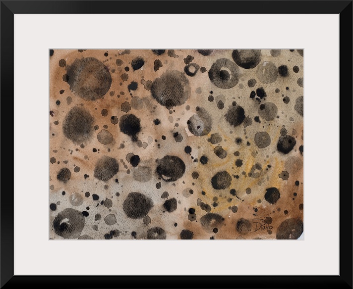 <p>A patterned watercolor painting with black paint splatter on a brown background with hints of gold.</p>