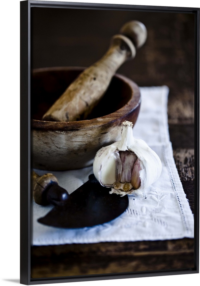 <p>Rustic garlic crucher and clove of garlic on rustic table vintage lace tablecloth.</p>