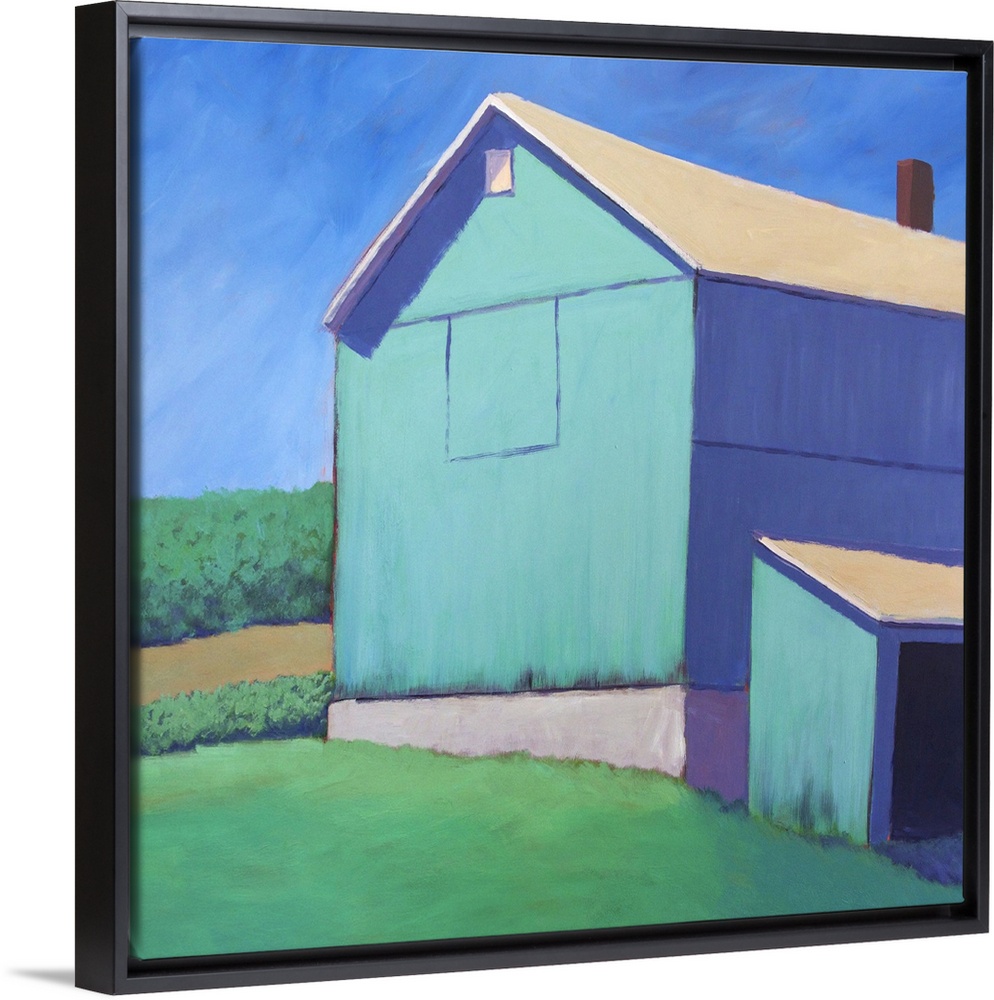 <p>Contemporary painting of a white barn in a rural field in afternoon light.</p>