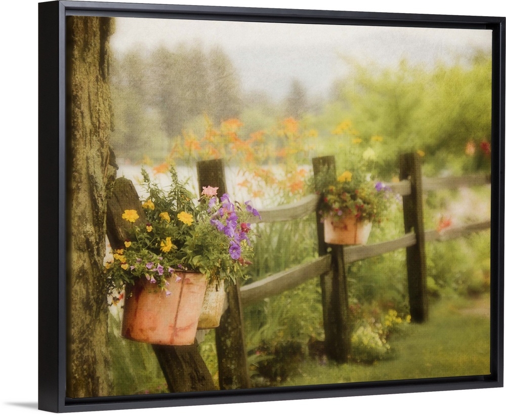 <p>Rustic wooden fence with flowers in clay pots hanging on posts, with Mirror Lake and mountains of Lake Placid,NY in background.</p>